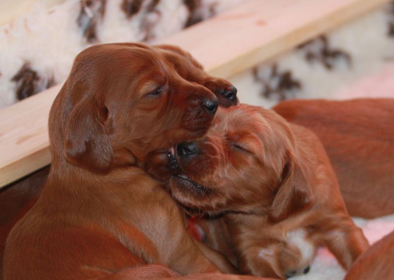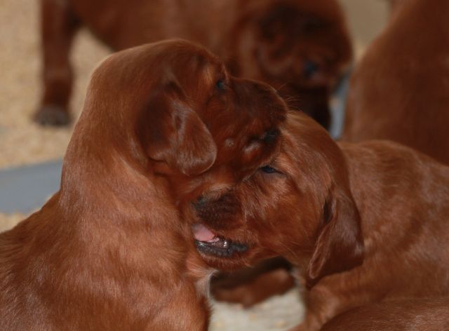 Eine spannende Woche liegt hinter uns. Die Kleinen entwickeln sich weiterhin prächtig. In dieser Woche sind die Sinne erwacht. Die Augen und Nasen haben sich in dieser Woche geöffnet und das Umfeld wird schon aktiv entdeckt. Die Kleinen können jetzt wenn sie möchten aus ihrer Wurfkiste heraus und entdecken die große weite Welt. Es ist soooo schön zu beobachten, wie sich die Geschwisterchen gegenseitig belecken und untersuchen. Auch das Welpenklo wird schon rege angenommen. Kein Welpe mag sein Nest beschmutzen und so ist es an der Zeit mit der Stubenreinheit zu beginnen. Mein Jungspund Nilsson darf nun auch schon mit in die Box und wartet sehnsüchtig darauf mit den Kleinen endlich spielen zu dürfen.