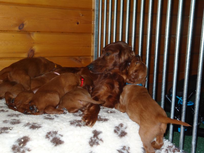 Aus den kleinen unbeholfenen roten Zwergen sind inzwischen kleine energiegeladene abenteuerlustige Welpen geworden. Das Inhouseterrain hat nicht mehr ausgereicht um die Entdeckungslust zu befriedigen. Mit 4,5 Wochen sind die Lütten in ihr Welpenhaus gezogen, wo sie einen großen Spielplatz mit Hundehütte und diversen Liegemöglichkeiten haben und über eine Hundeklappe in den Außenauslauf gelangen können. Binnen kürzester Zeit war das Terrain untersucht und für gut befunden worden. Die ersten Besucher sind empfangen worden und Nilsson ist ein perfekter Onkel zum Bespaßen. Orlando beobachtet lieber alles von erhöhter Position.