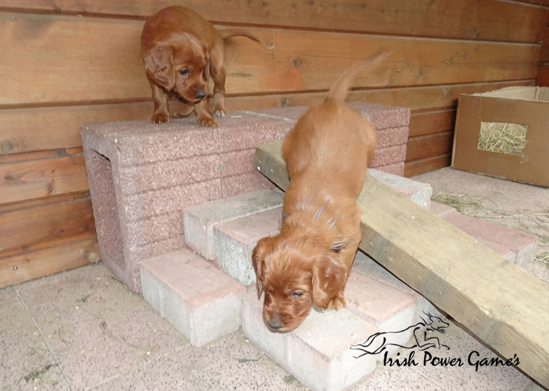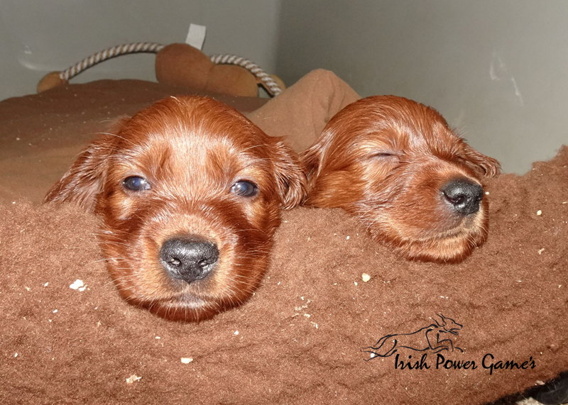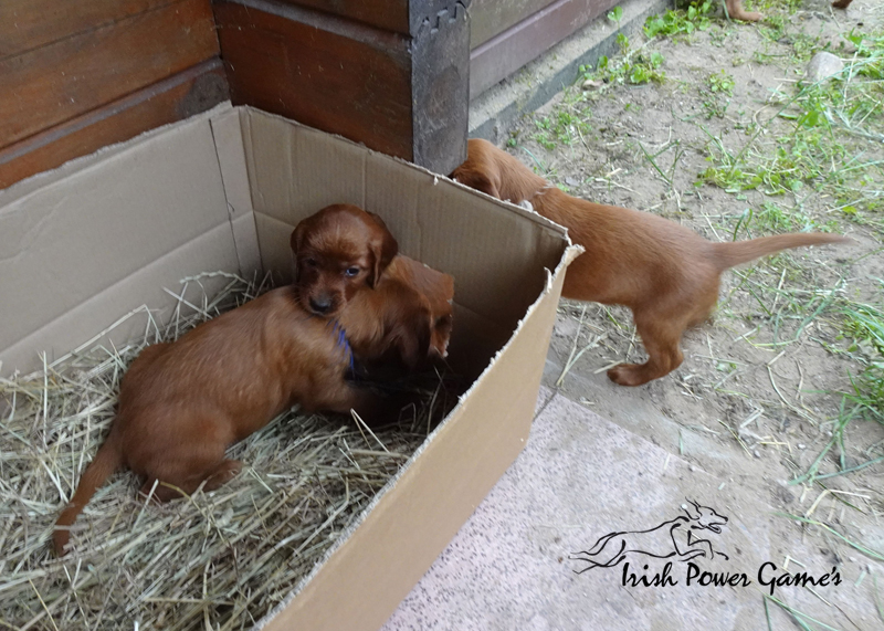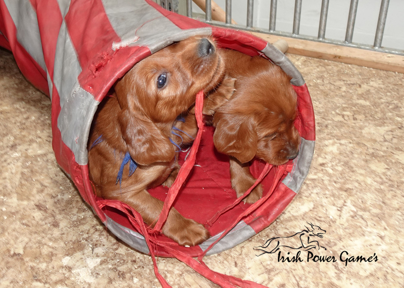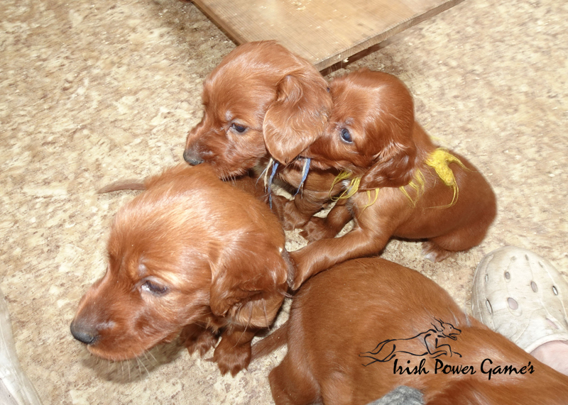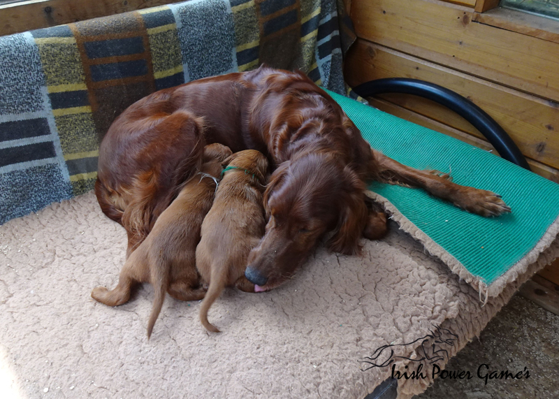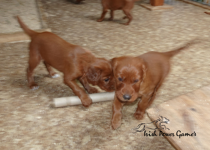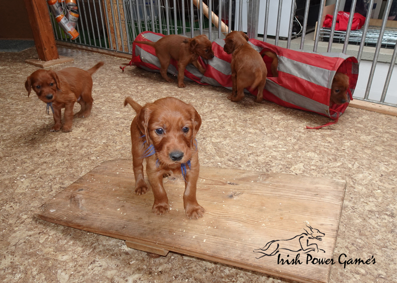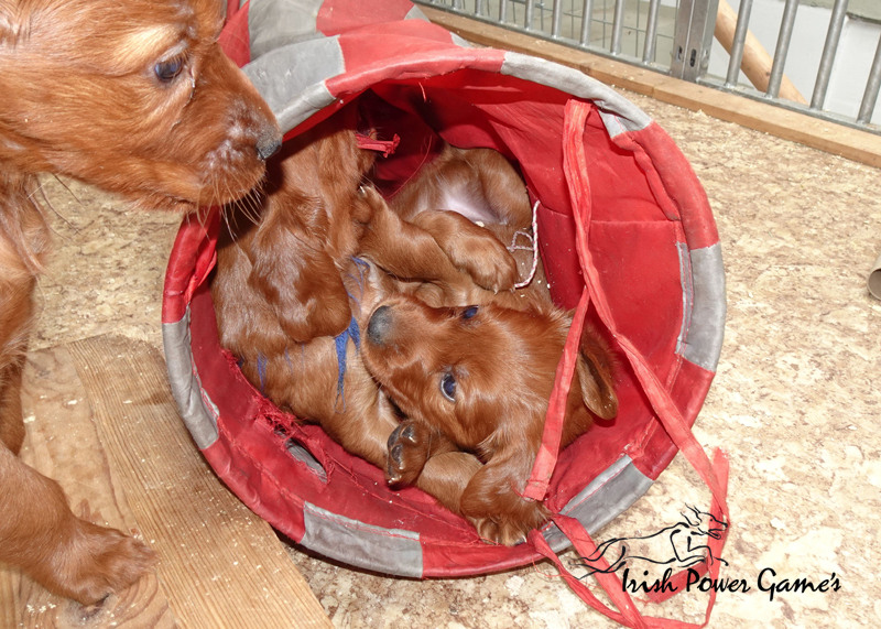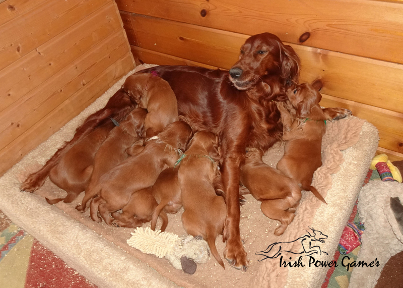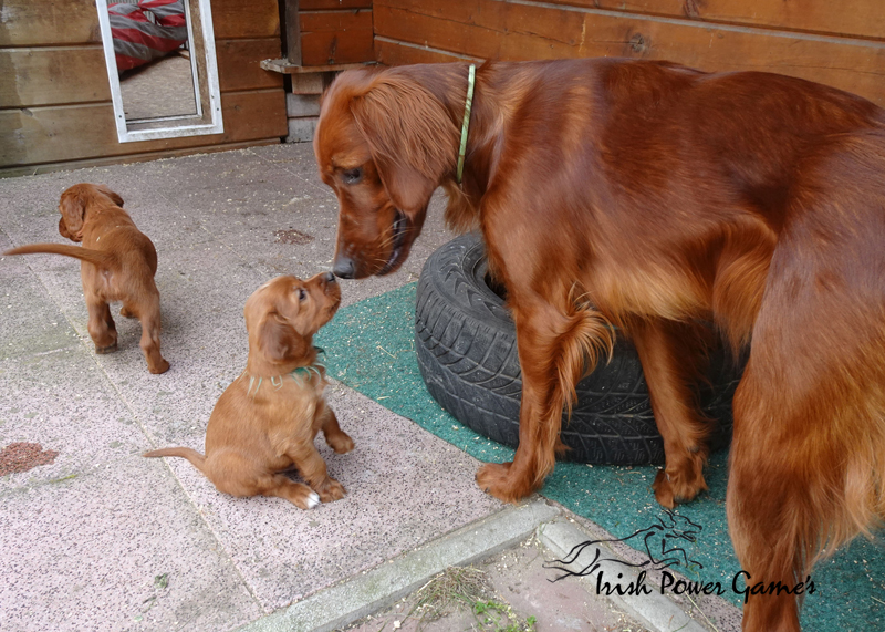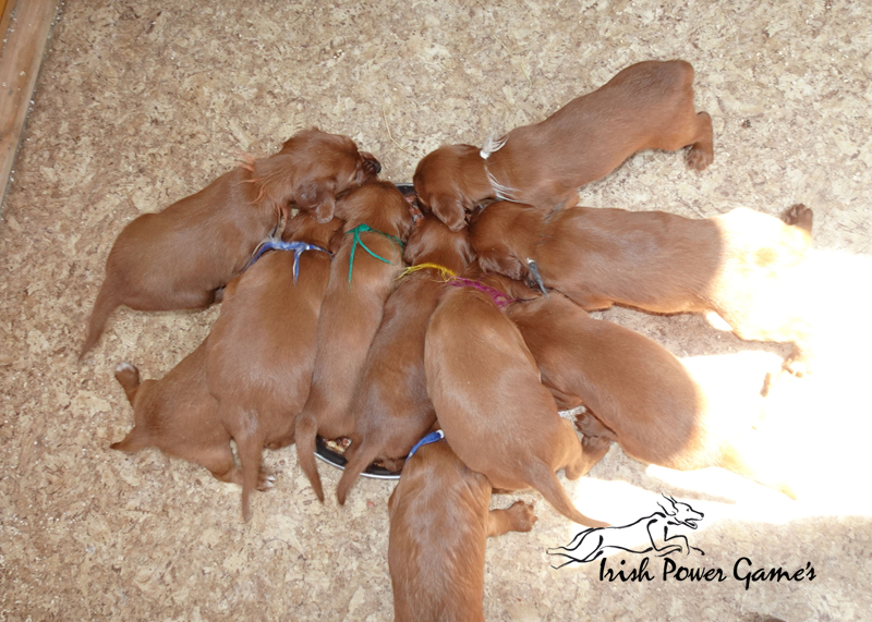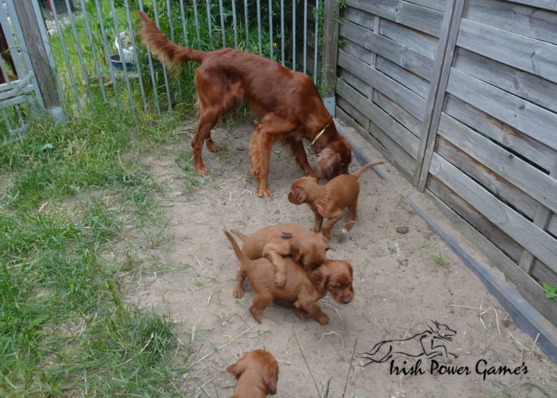 Die Sinne der Lütten erwachen mehr und mehr. Mutti Lia möchte inzwischen nicht mehr so gern zu der gefrässigen Meute. Sie genießt es allerdings wenn ich ihr 2 bis 3 Welpen an die Zitzen gebe. Die Freßkultur am Futterring läßt auch noch zu wünschen übrig. Insbesondere bei den Fleischmahlzeiten geht es drunter und drüber. Nachts ist die Meute sehr brav und läßt mich ab und an sogar bis 7 Uhr schlafen.