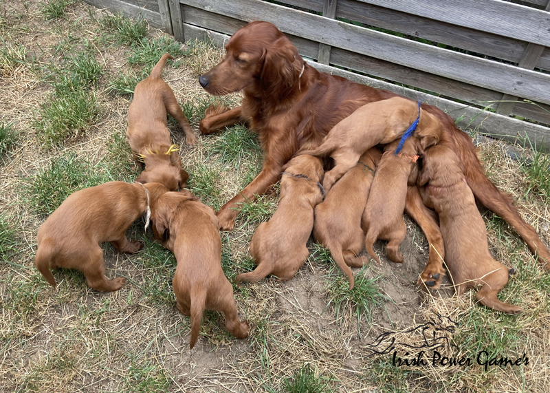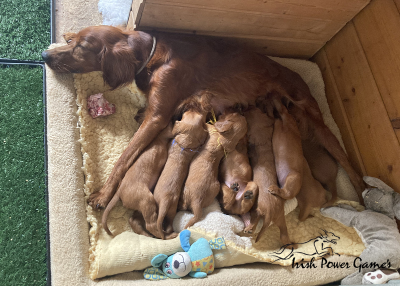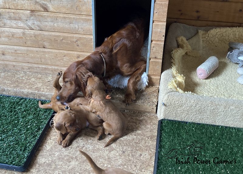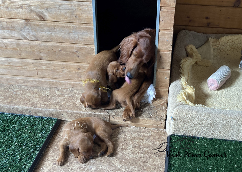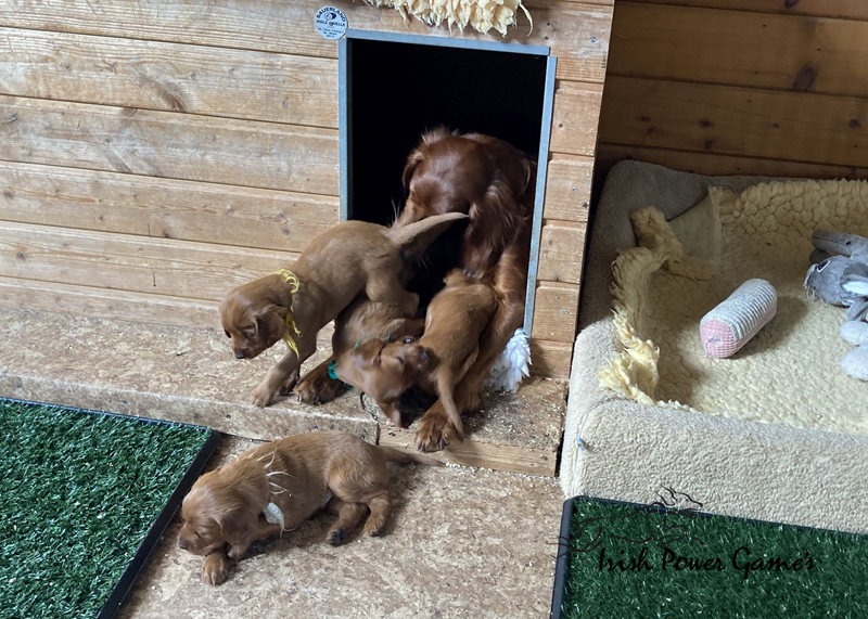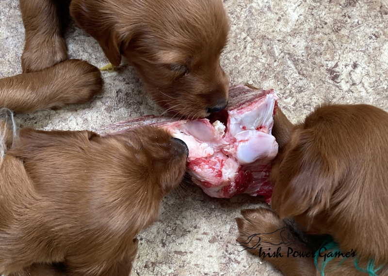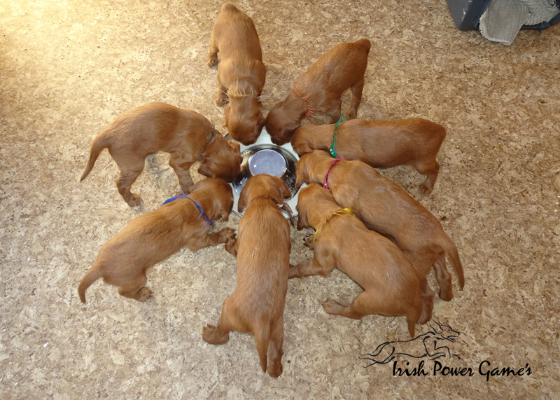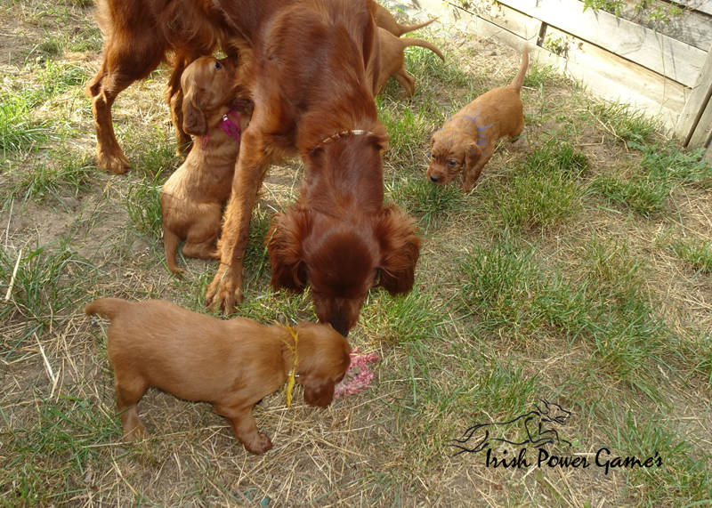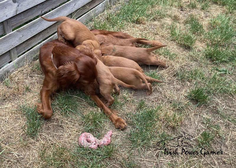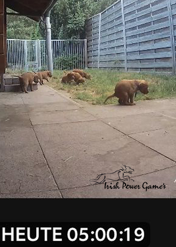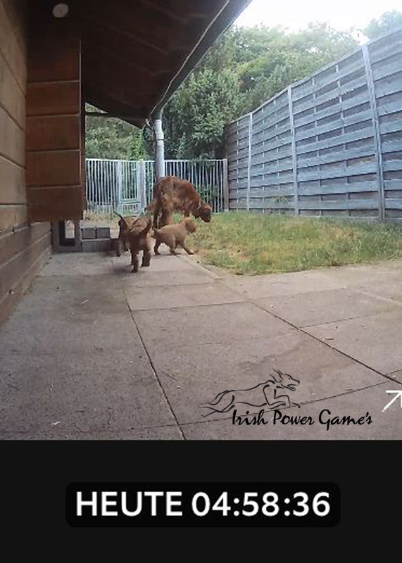 Nun sind die lütten E-chen schon 5 Wochen alt und in dieser Woche ist viel passiert. Zunächst stand der Umzug ins Hundehaus an. Hier ist mehr Platz und so können die Lütten sich entfalten. Braydee macht alles nach wie vor hervorragend. Die Welpen haben diese Woche die erste Ziegenmilch, Tatar, Pansen und Hühnerfleisch kennen gelernt. Braydee erbricht auch noch ihren Welpen ihr Futter und so hat sie Entlastung an den Zitzen. Auch den ersten fleischigen Knochen durften die Kleinen schon probieren. Morgens um 5 Uhr führt Braydee die Mannschaft nach draußen um sich zu lösen. Die Kameraaufzeichnung ist der Beweis.