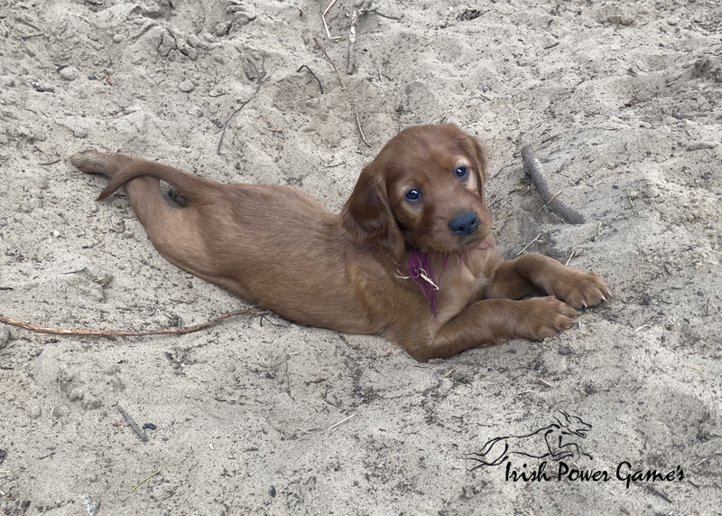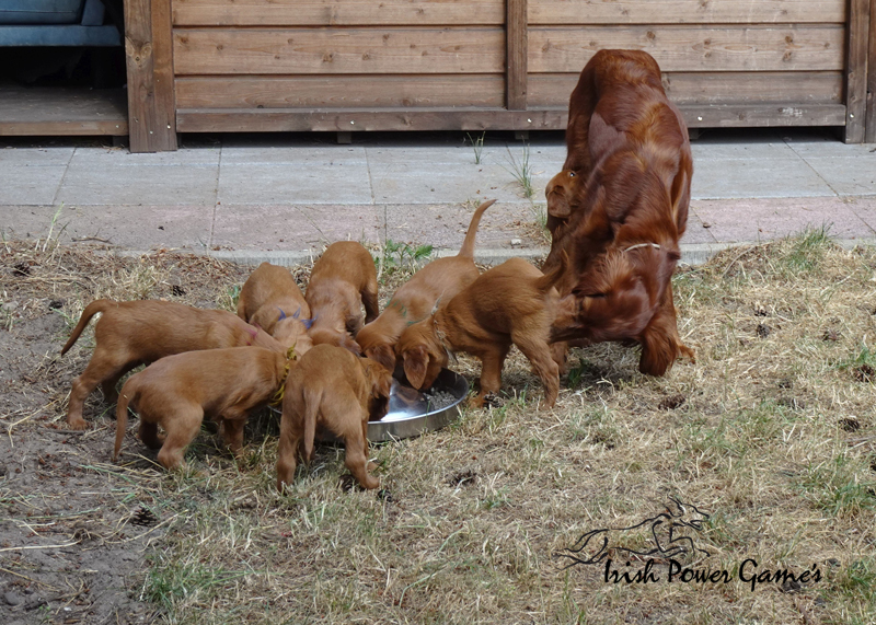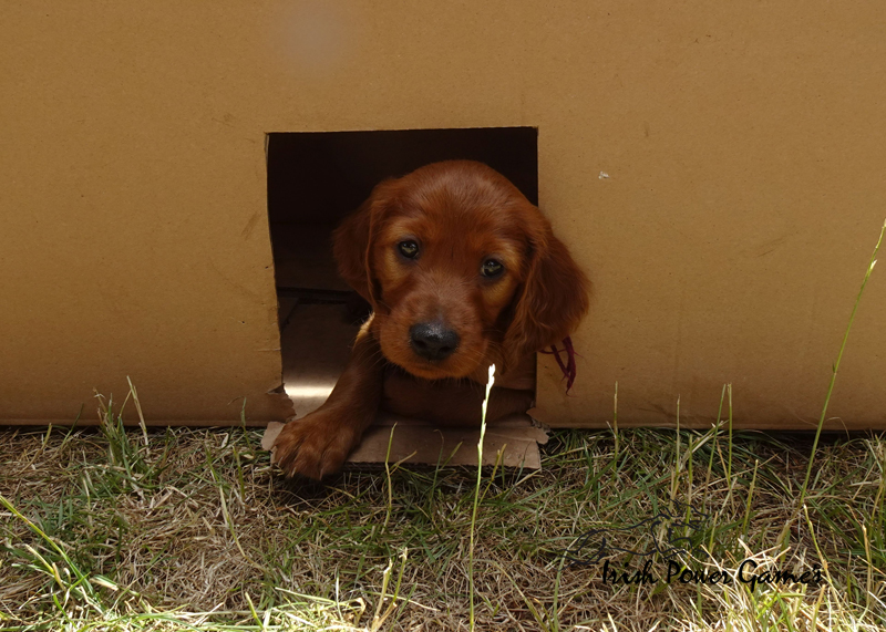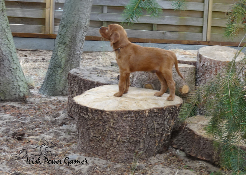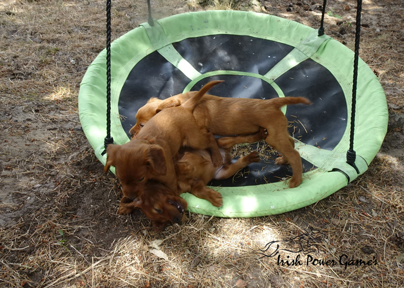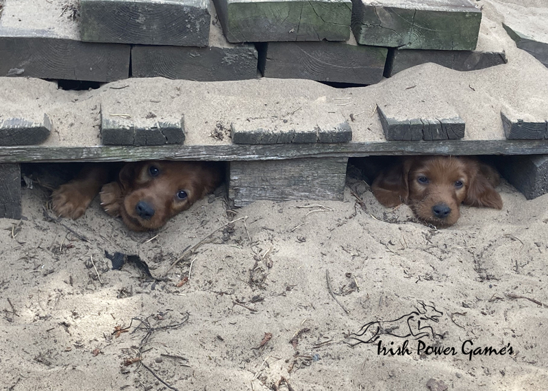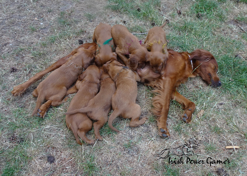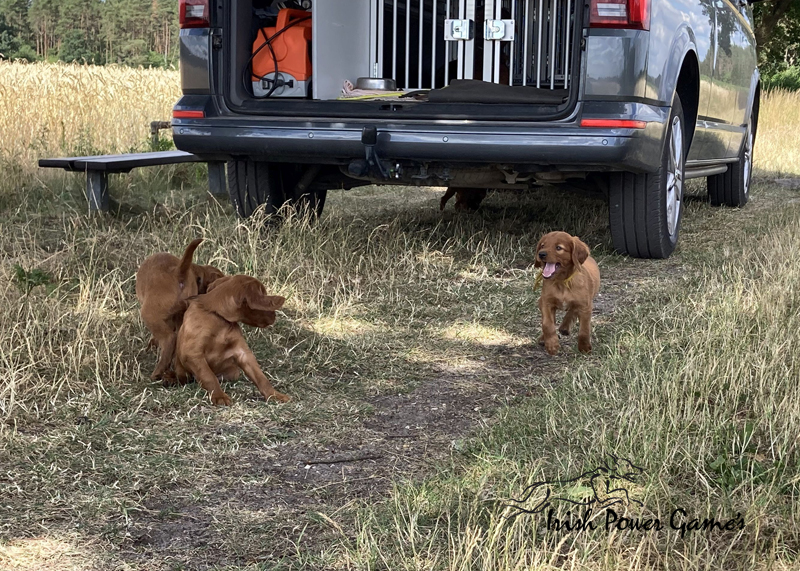 Die Lütten entwickeln sich prächtig und Braydee ist eine geniale fürsorgliche Mutter. Sie ist fast immer bei den Welpen und hat sich ein feines Plätzchen ausgesucht, wo sie den Überblick über ihre Bande hat. Diese Woche war ordentlich was los. Die ersten Besucher waren da, die Spielgeräte wurden ausgiebig getestet, die erste Autofahrt wurde mit Bravour erledigt, der erste Wildkontakt und, und, und. Es ist ordentlich was los im Hause der Irish Power Game´s.