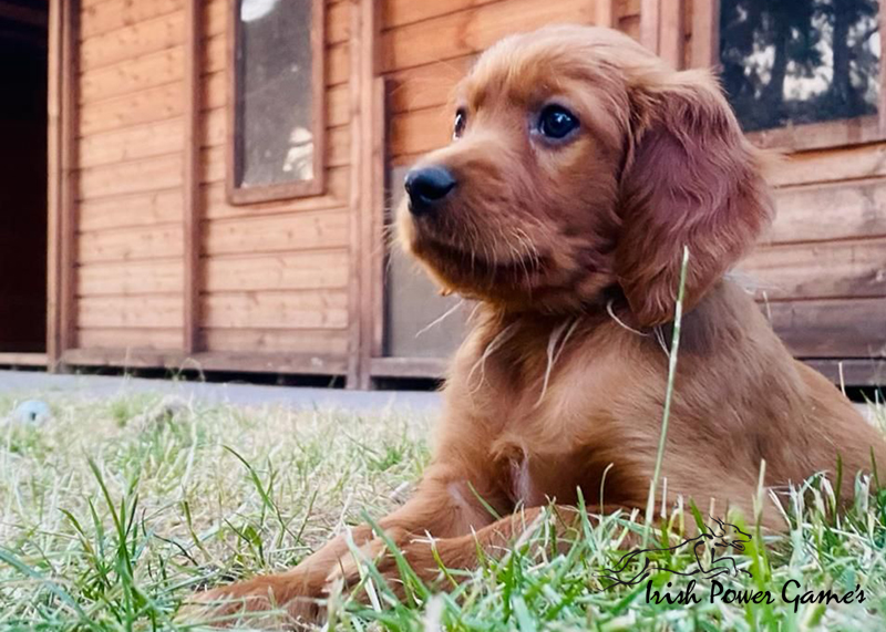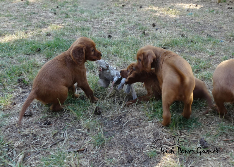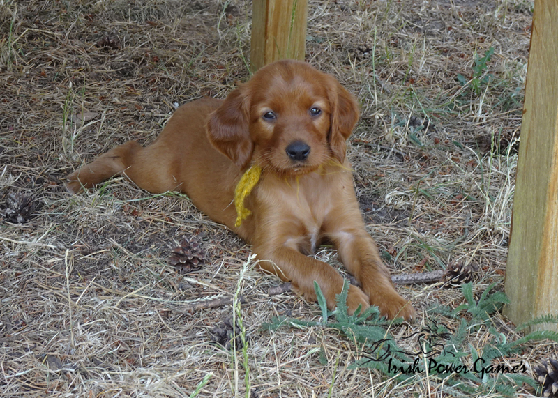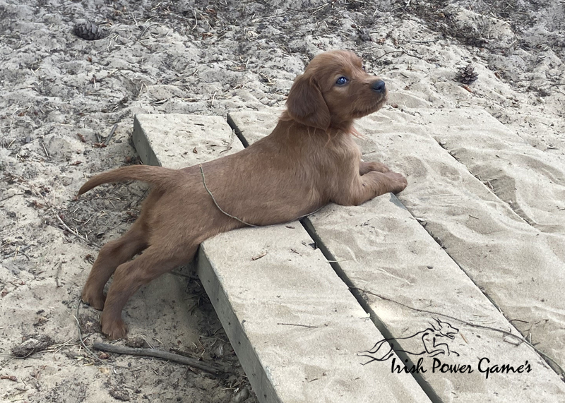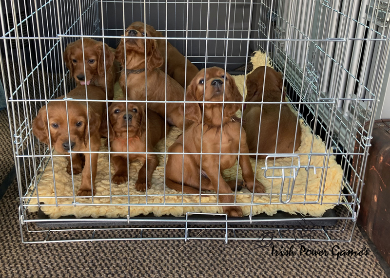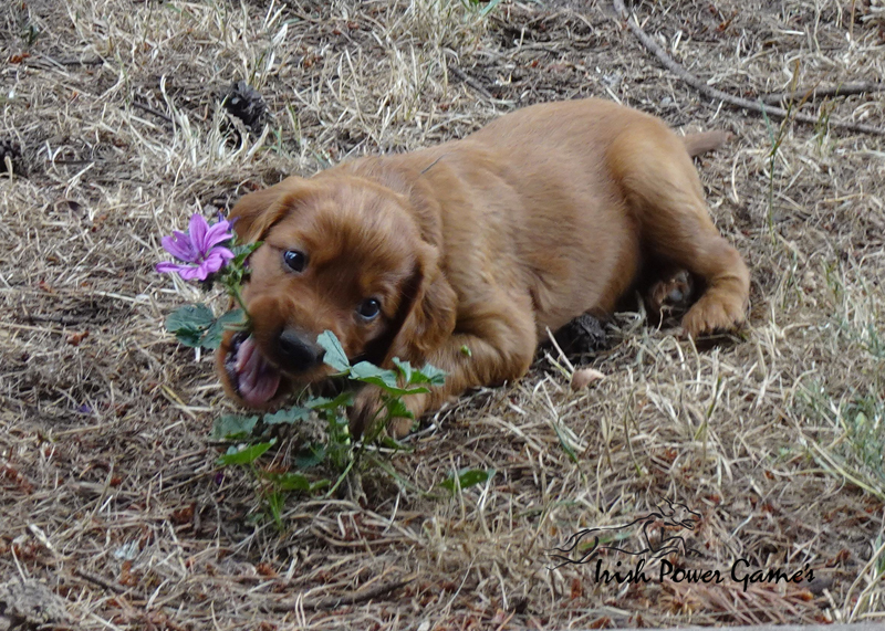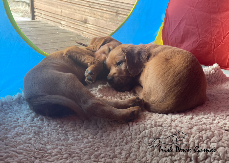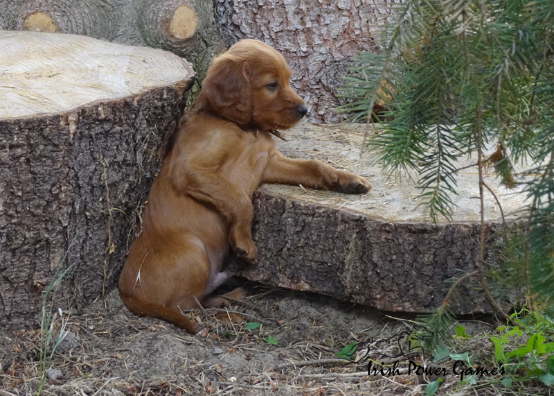 Die Lütten entwickeln sich prächtig und Braydee ist eine geniale fürsorgliche Mutter. Sie ist fast immer bei den Welpen und hat sich ein feines Plätzchen ausgesucht, wo sie den Überblick über ihre Bande hat. Diese Woche war ordentlich was los. Die ersten Besucher waren da, die Spielgeräte wurden ausgiebig getestet, die erste Autofahrt wurde mit Bravour erledigt, der erste Wildkontakt und, und, und. Es ist ordentlich was los im Hause der Irish Power Game´s.