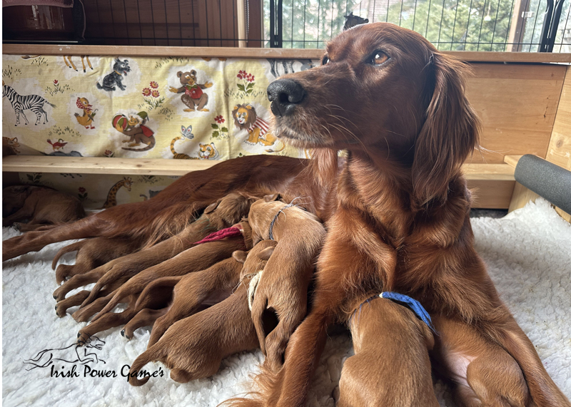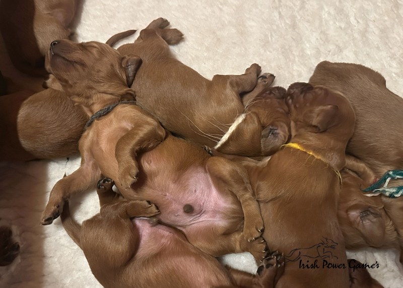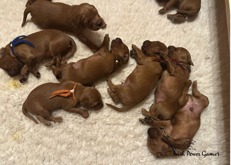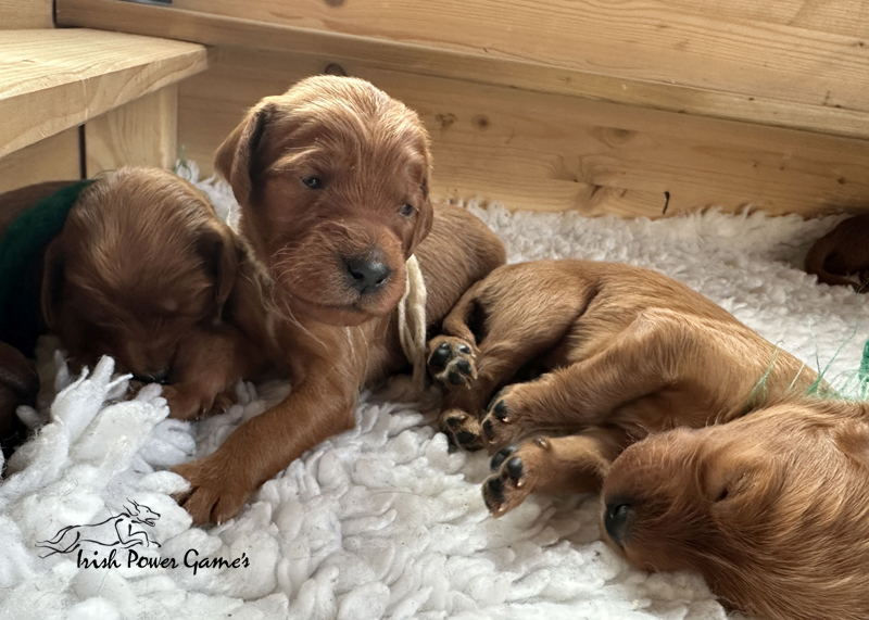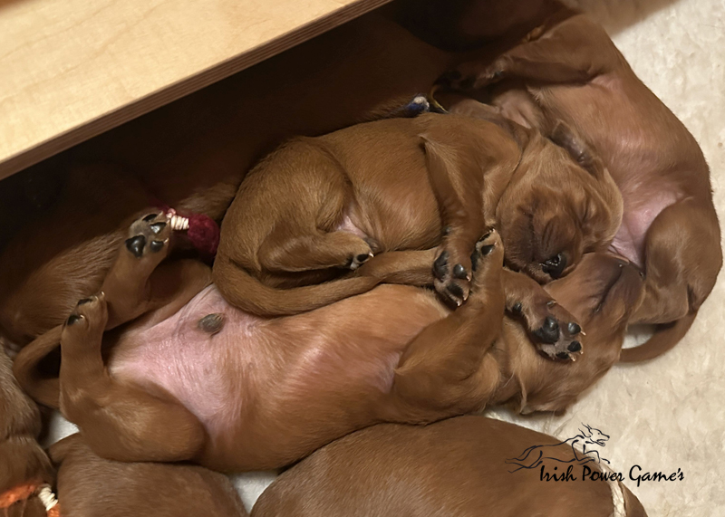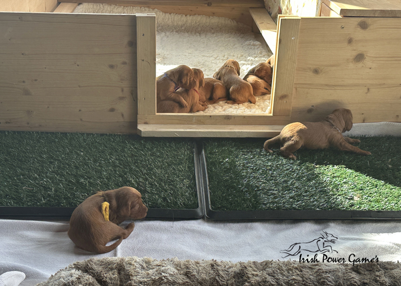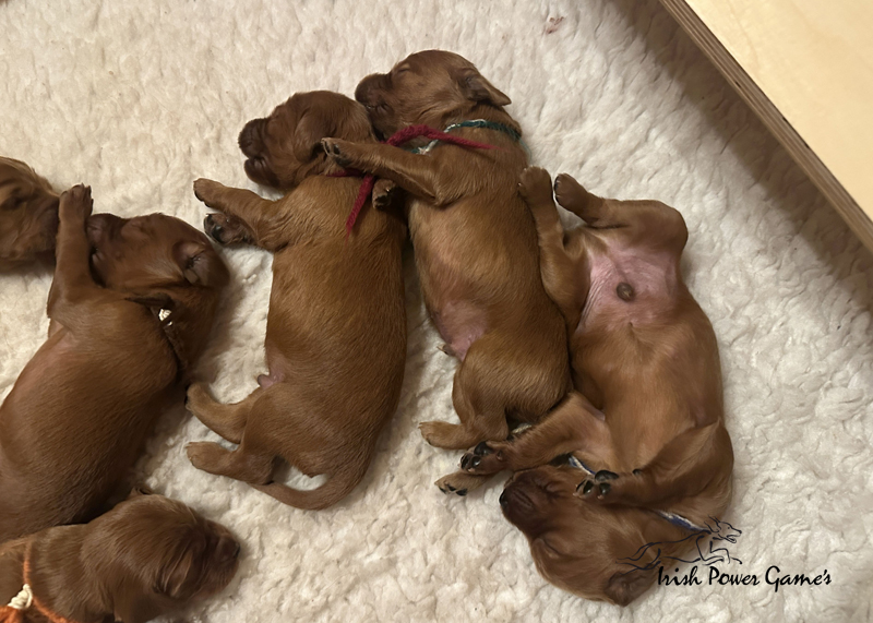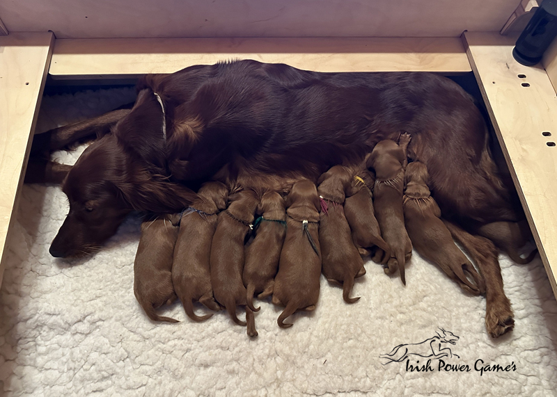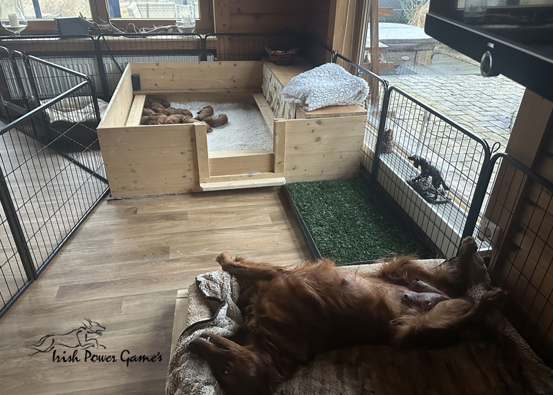 Die zweite Woche ist vorbei und die Welpen entwickeln sich weiterhin prächtig. Eine Menge ist diese Woche passiert. Die Sinnesorgane sind erwacht. Die Äuglein sind aufgegangen und die ersten Laufversuche sehen schon ganz passabel aus. Auch auf Geräusche reagiert die Mannschaft schon. Der erste Umzug ins Wohnzimmer ist nun auch schon erfolgt. Hier ist mehr Platz zum baldigen Erkunden der großen weiten Welt. Braydee ist nun nicht mehr ständig in der Wurfkiste, sondern beobachtet ihre Brut von außen und geht nur zum Putzen und säugen noch hinein. Mutti wird beim Betreten der Box direkt bemerkt und der Run auf die Zitzen beginnt. Einfach goldig anzuschauen. Langsam wird es eng an den Zitzen. Papa Nilsson darf auch schon dabei sein und beobachtet mit Hingabe seine Brut. Die Wurfkiste ist nun offen und die ersten Erkundungen haben stattgefunden. Alles noch recht unbeholfen, aber der erste Schritt ist getan.