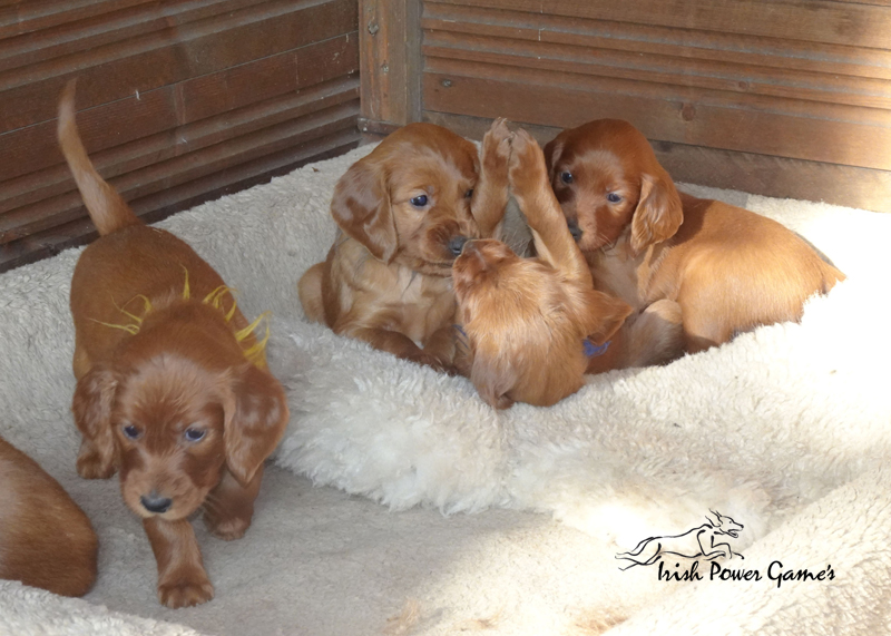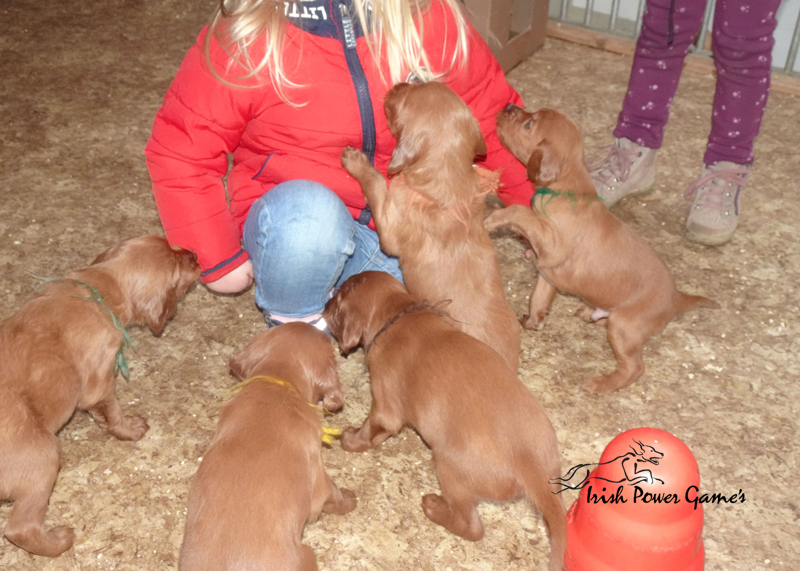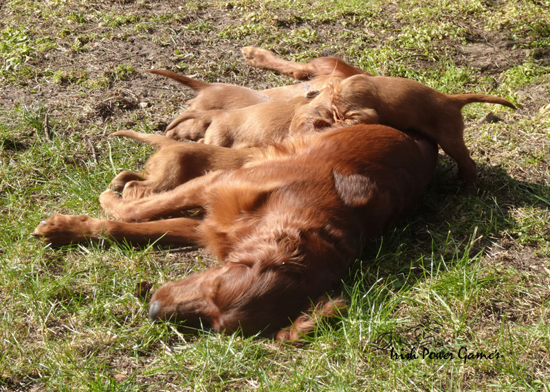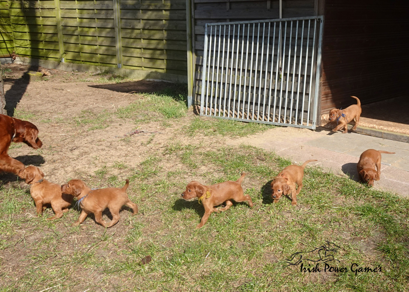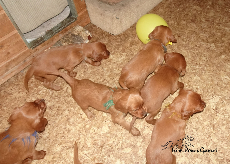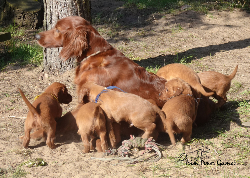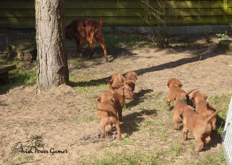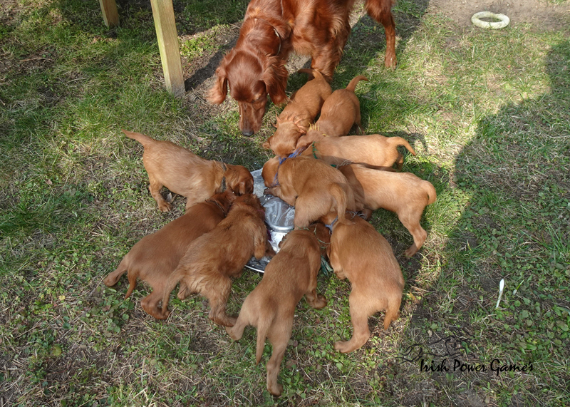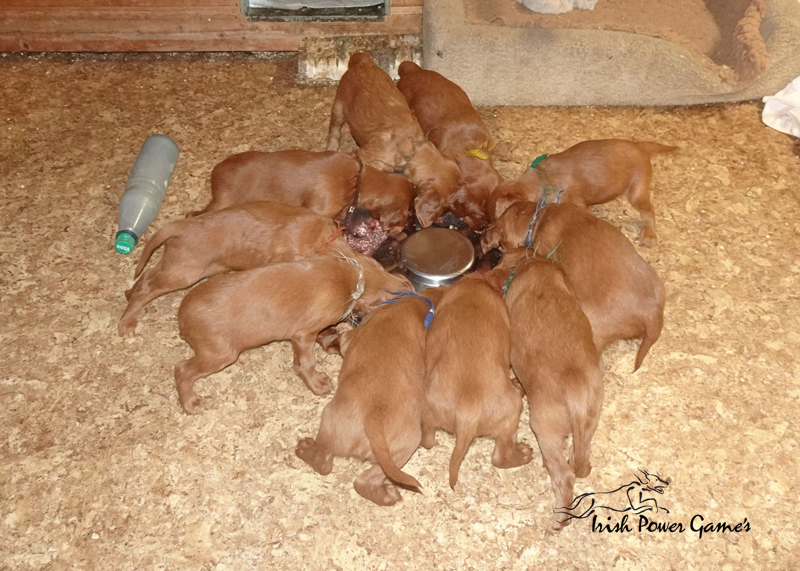 Da die kleine Mannschaft nun mehr erleben möchte, sind sie nun ins 1. Welpenhaus gezogen. Hier ist wesentlich mehr Platz, es können neue Spielgeräte erkundet werden und ein Auslauf mit einer Hundeklappe steht zur Verfügung, daß die Lütten möglichst bald stubenrein werden. Über mein Küchenfenster kann ich jederzeit sehen was die Mannschaft so treibt und gehe natürlich dann raus um das Treiben genau zu beobachten. Geschlafen wird in ihrer geliebten Kudde oder in der Hundehütte mit Heizplatte. Klar ist, daß alle Welpen sehr aufgeschlossen neuen Sachen gegenüber sind und auch richtig Freude mit den Nachbarskindern hatten. Mutti Braydee ist natürlich noch regelmäßig bei den Welpen und säugt sie auch draußen auf dem Rasen inzwischen im Stehen. Eine Geräusch-CD oder das Radio läuft über Tag, täglich wird der Vorraum gesaugt und ich mache auch mit den Futterschüsseln schon ordentlich Lärm. Auf den Futterpfiff reagiert die Mannschaft auch schon richtig gut. Die kleineren der Mannschaft genießen eine Sonderration Milch bei Mutti im Körbchen, denn alle 10 gefräßigen Mäuler gleichzeitig zu stopfen ist Braydee doch inzwischen etwas unangenehm. Die von mir angebotenen Milch und Fleischmahlzeiten finden sie natürlich auch richtig Klasse. Es wird untereinander bereits schon ordentlich gerauft und man erkennt erste Charaktere. Auch die ersten Luftballons hat die Mannschaft schon zum Platzen gebracht und die ersten Gegenstände werden fleißig verschleppt. Als Krönung zum Wochenende durfte die Mannschaft auch schon mal bei dem tollen Wetter den 2. Welpenauslauf kennenlernen. Der wurde absolut für gut empfunden und Mutti Braydee hat nun mehr Platz um mit der Mannschaft zu toben.