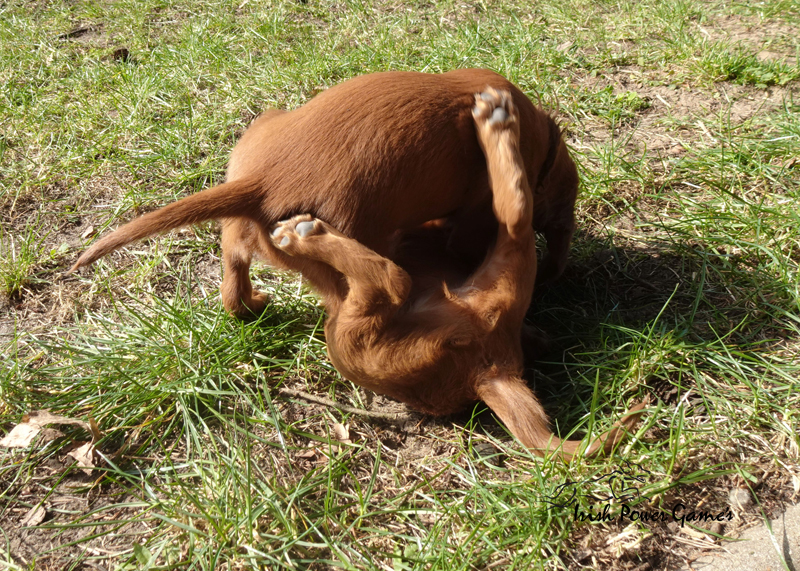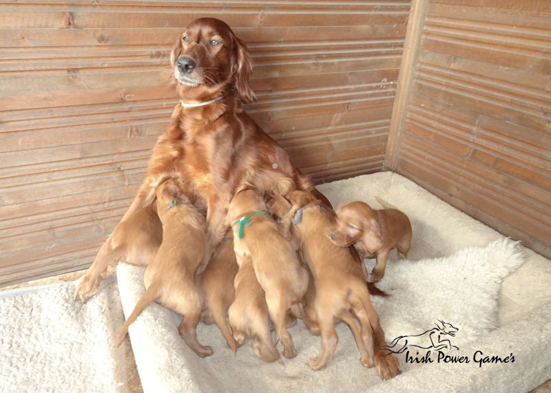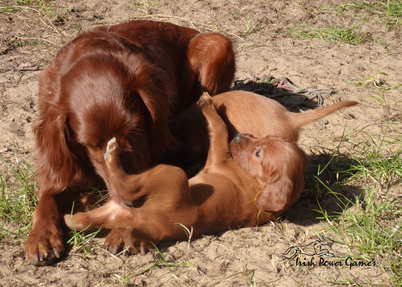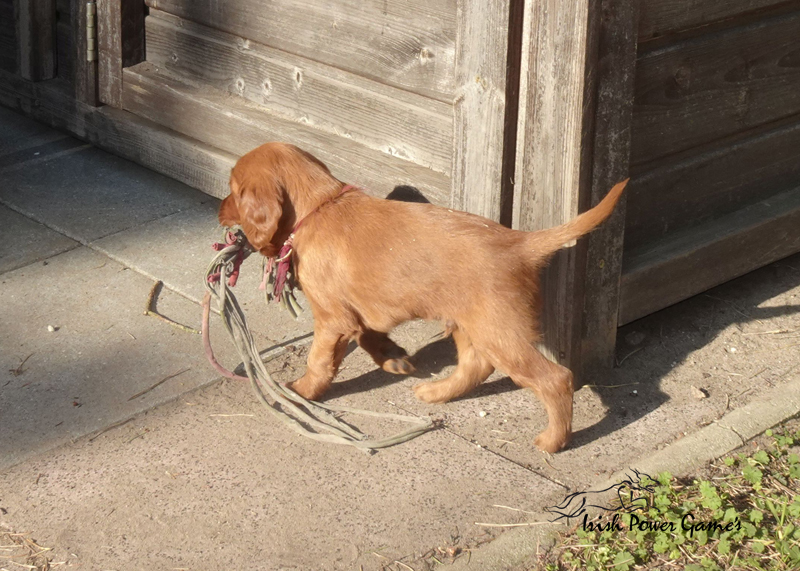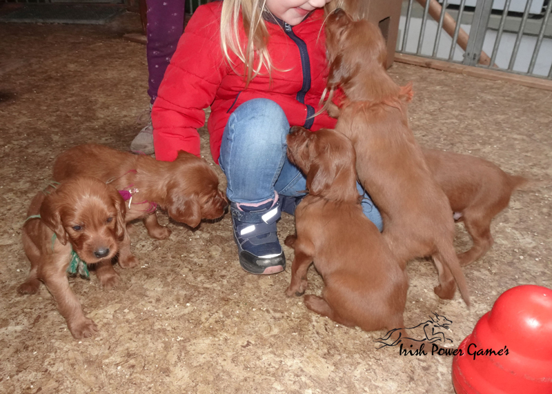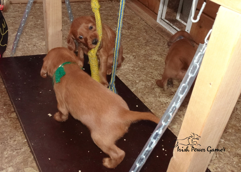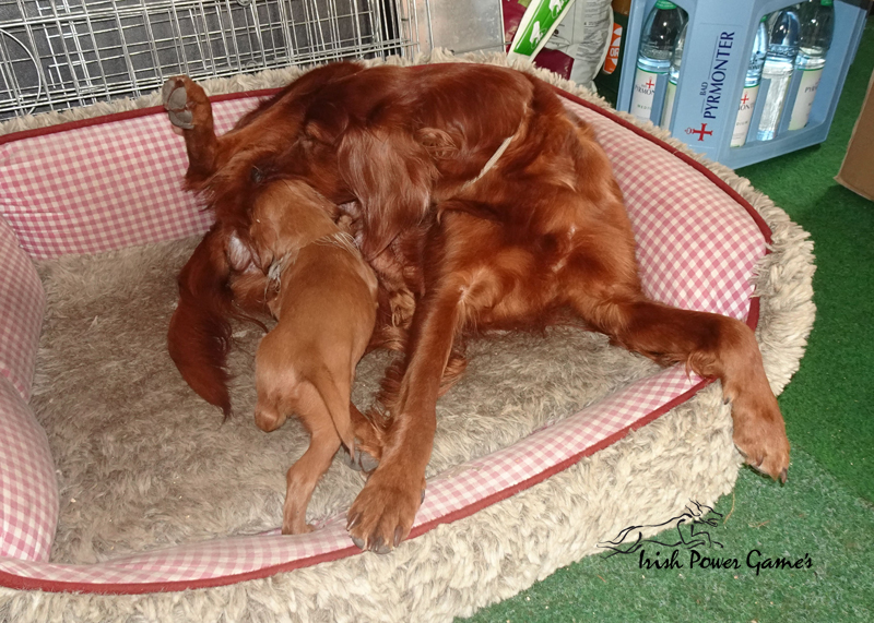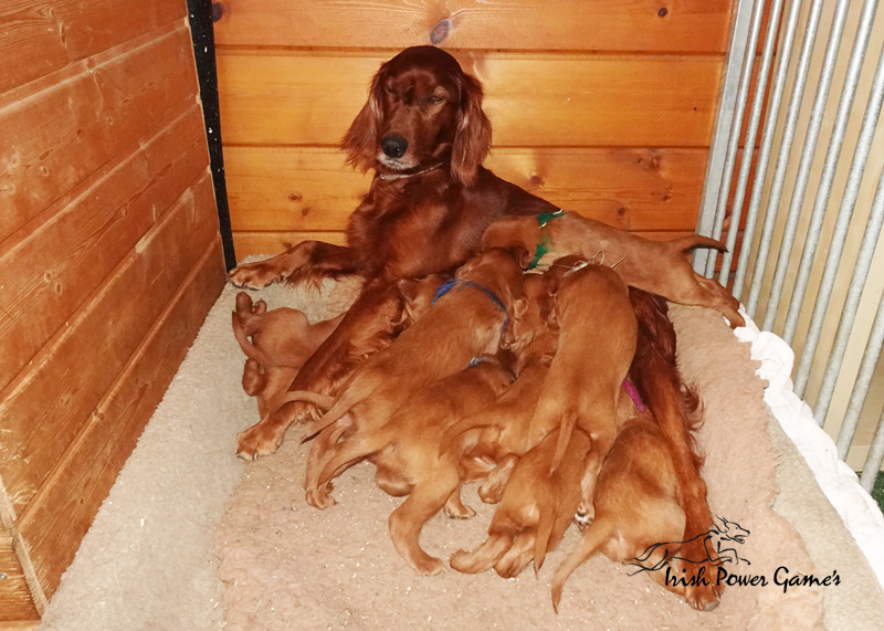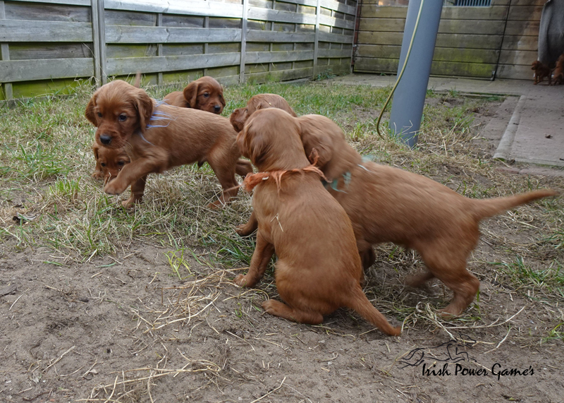 Da die kleine Mannschaft nun mehr erleben möchte, sind sie nun ins 1. Welpenhaus gezogen. Hier ist wesentlich mehr Platz, es können neue Spielgeräte erkundet werden und ein Auslauf mit einer Hundeklappe steht zur Verfügung, daß die Lütten möglichst bald stubenrein werden. Über mein Küchenfenster kann ich jederzeit sehen was die Mannschaft so treibt und gehe natürlich dann raus um das Treiben genau zu beobachten. Geschlafen wird in ihrer geliebten Kudde oder in der Hundehütte mit Heizplatte. Klar ist, daß alle Welpen sehr aufgeschlossen neuen Sachen gegenüber sind und auch richtig Freude mit den Nachbarskindern hatten. Mutti Braydee ist natürlich noch regelmäßig bei den Welpen und säugt sie auch draußen auf dem Rasen inzwischen im Stehen. Eine Geräusch-CD oder das Radio läuft über Tag, täglich wird der Vorraum gesaugt und ich mache auch mit den Futterschüsseln schon ordentlich Lärm. Auf den Futterpfiff reagiert die Mannschaft auch schon richtig gut. Die kleineren der Mannschaft genießen eine Sonderration Milch bei Mutti im Körbchen, denn alle 10 gefräßigen Mäuler gleichzeitig zu stopfen ist Braydee doch inzwischen etwas unangenehm. Die von mir angebotenen Milch und Fleischmahlzeiten finden sie natürlich auch richtig Klasse. Es wird untereinander bereits schon ordentlich gerauft und man erkennt erste Charaktere. Auch die ersten Luftballons hat die Mannschaft schon zum Platzen gebracht und die ersten Gegenstände werden fleißig verschleppt. Als Krönung zum Wochenende durfte die Mannschaft auch schon mal bei dem tollen Wetter den 2. Welpenauslauf kennenlernen. Der wurde absolut für gut empfunden und Mutti Braydee hat nun mehr Platz um mit der Mannschaft zu toben.